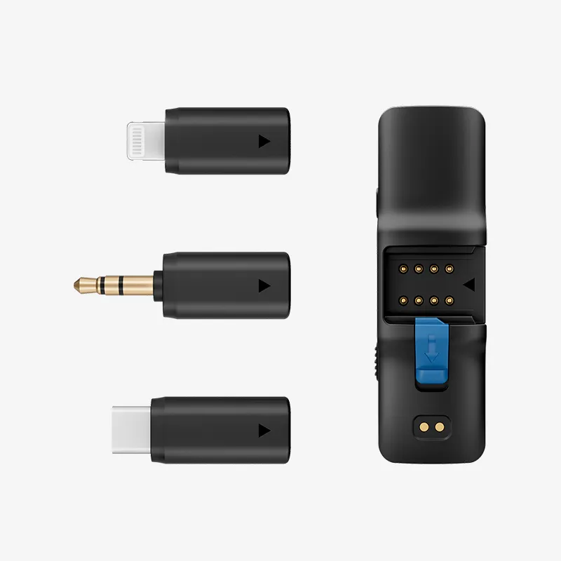 BOYALINK 2 با سه آداپتور قابل تعویض (USB-C، لایتنینگ، و ۳.۵ میلیمتری TRS) ارائه میشود که امکان اتصال آسان به دوربینها، موبایلهای اندروید و iOS و لپتاپها را فراهم میسازد. -